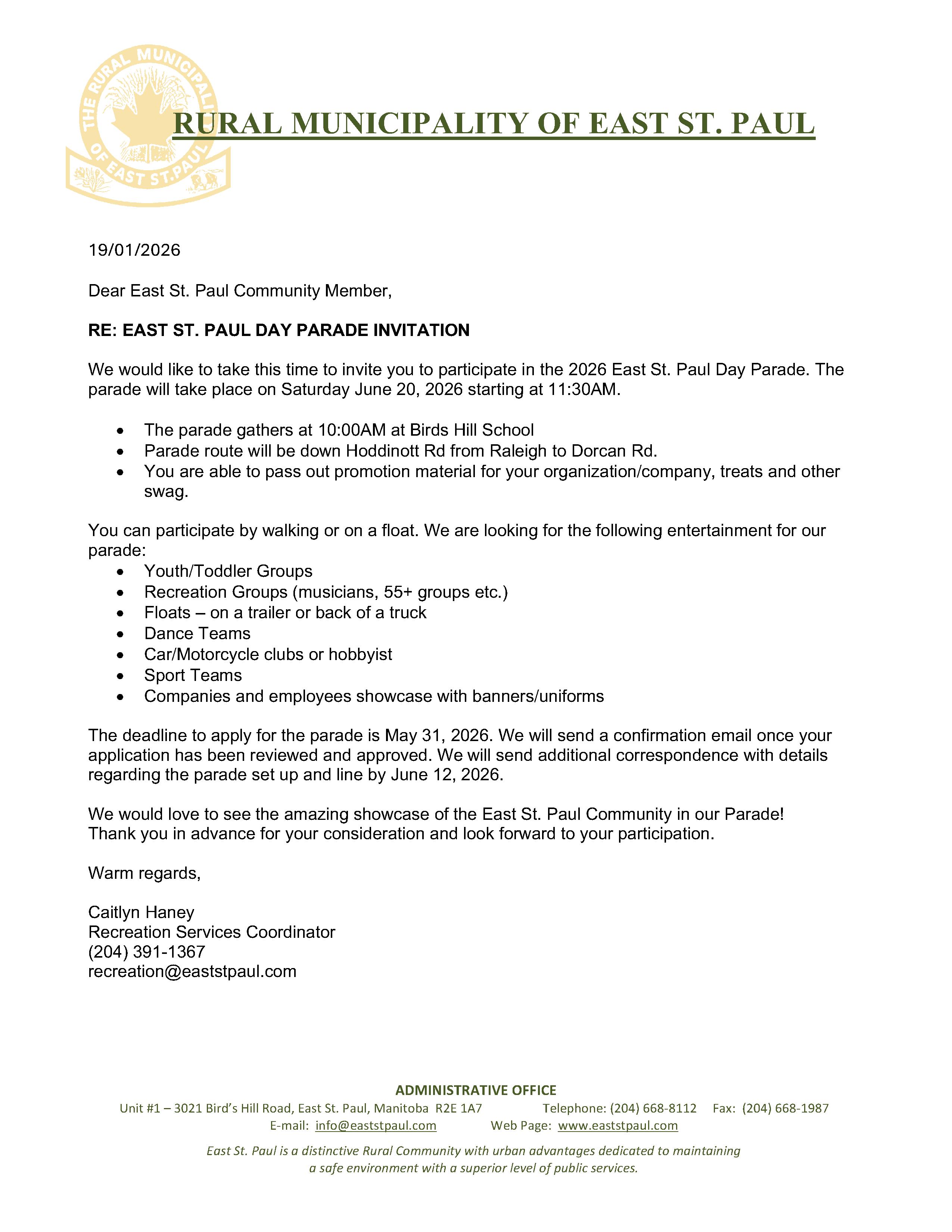 Parade & Community Booth applications are currently open. Please contact Caitlyn at recreation@eaststpaul.com if you have any questions.