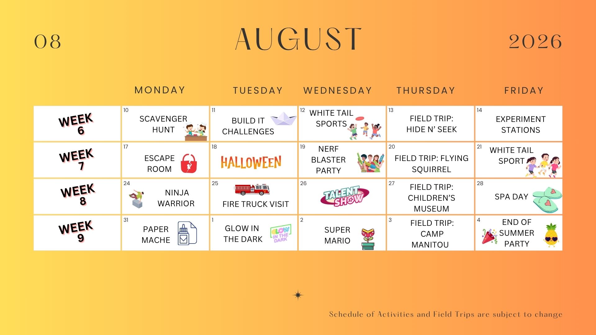 - Last Week of Camp (Aug. 31 - Sept. 4). Maximum capacity: 35 campers. Spots may open up, pending staff availability.
